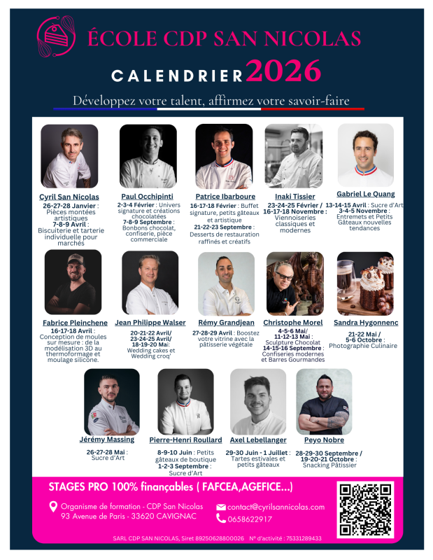 Pour 2026, l’école accueille une sélection de Chefs reconnus au niveau national et international, spécialisés dans la pâtisserie de boutique, les entremets contemporains, la chocolaterie, la confiserie, la viennoiserie, la photographie culinaire et bien plus encore.